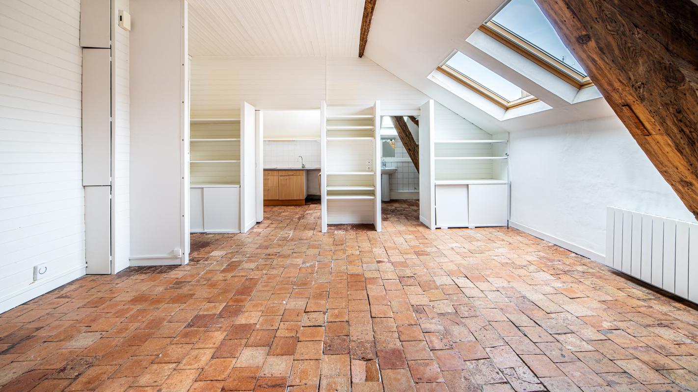 T2 bis en bon état, plein de charme et très ensoleillé, au calme offrant de beaux volumes : entrée, bureau, réception sur tomettes avec cheminée, cuisine, salle de bains, WC et chambre avec placard.