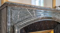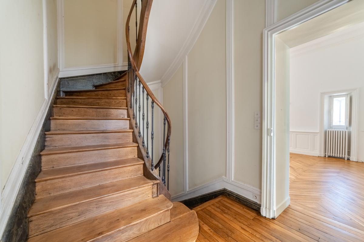 Entrée desservant une réception sur parquet à bâtons rompus et cheminée d'époque.