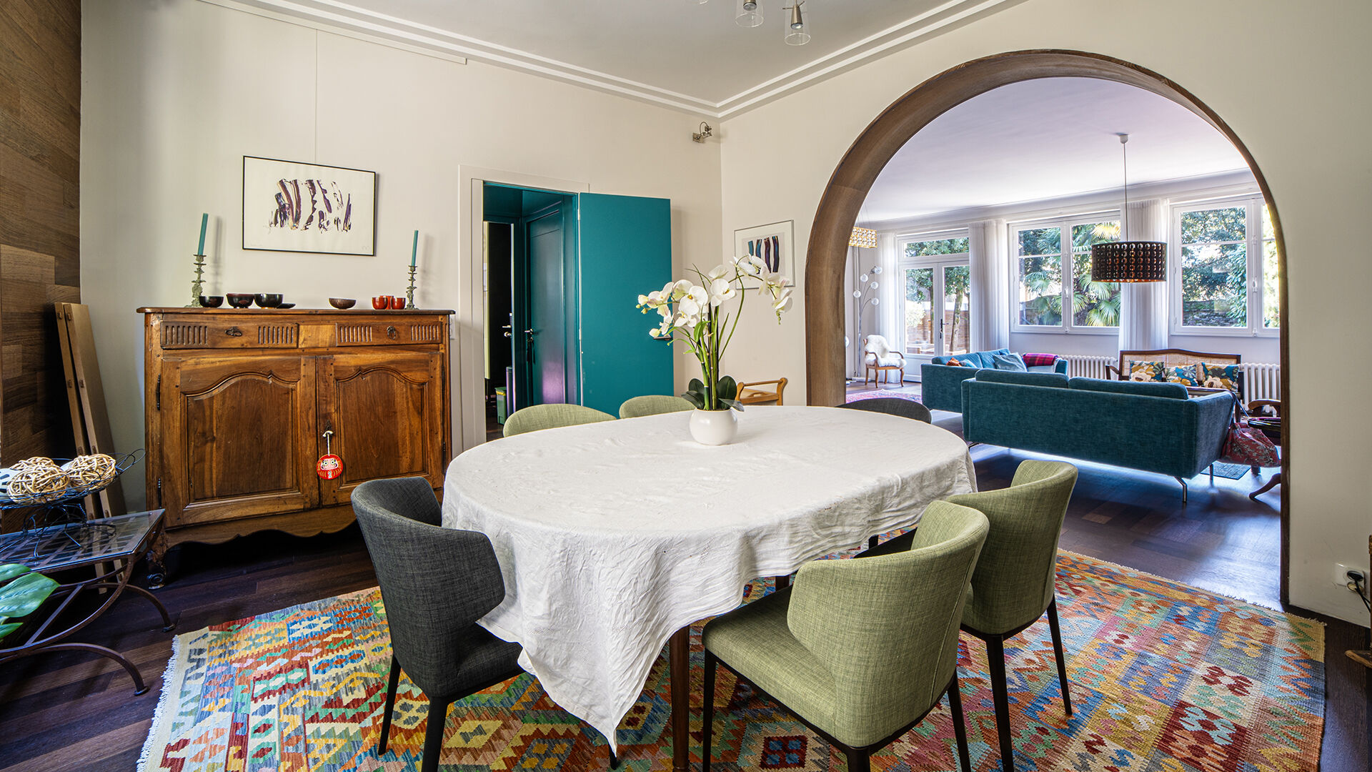 Au rez-de-chaussée, une double entrée avec dégagement mène à un bureau, une vaste réception avec cheminée, une salle à manger ainsi qu'une cuisine avec arrière-cuisine. Un second dégagement dessert un WC indépendant.