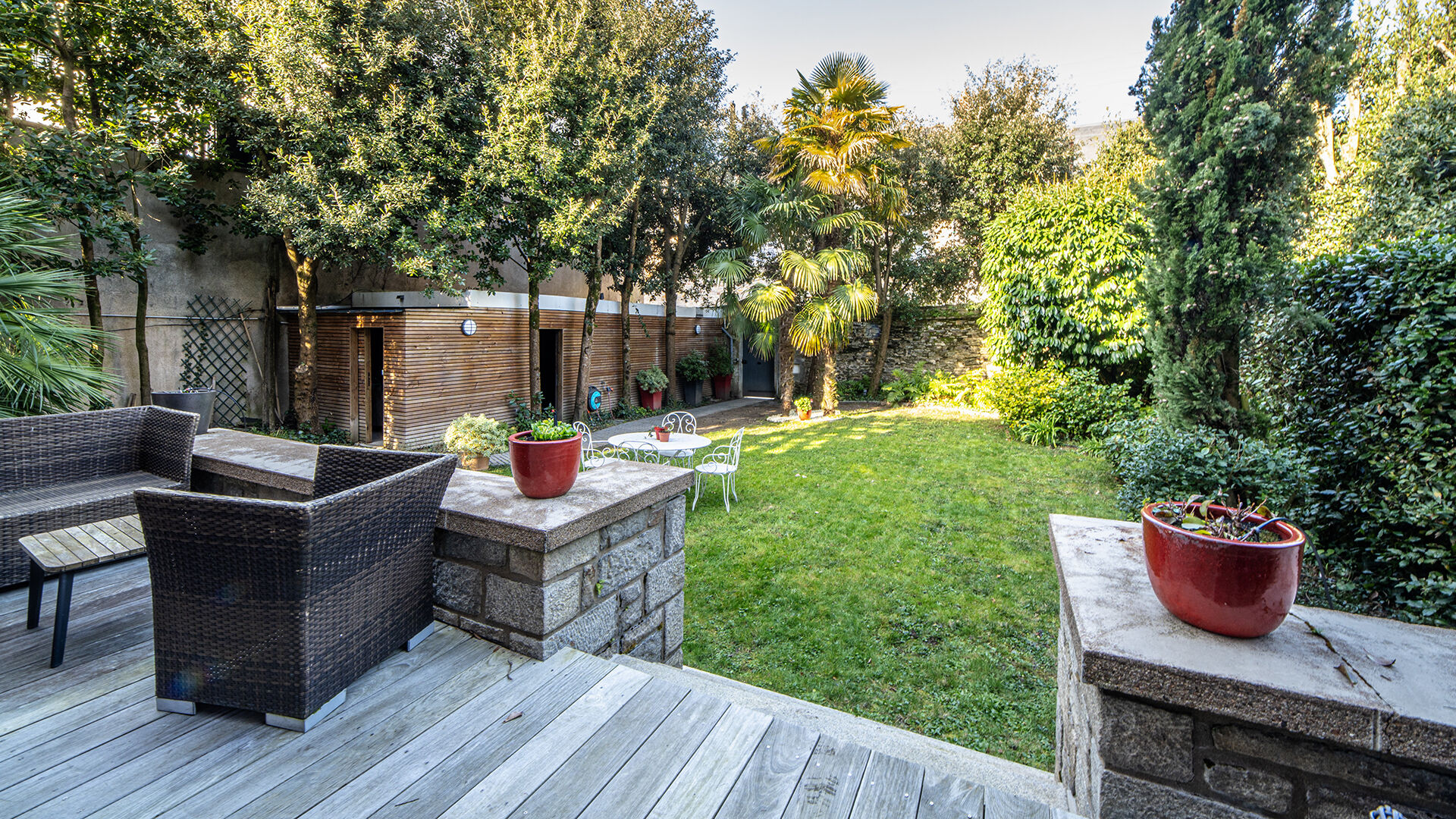 A l'extérieur, le jardin soigneusement aménagé dispose de deux terrasses et d'un abri de jardin, créant un véritable havre de paix en plein coeur de la ville.