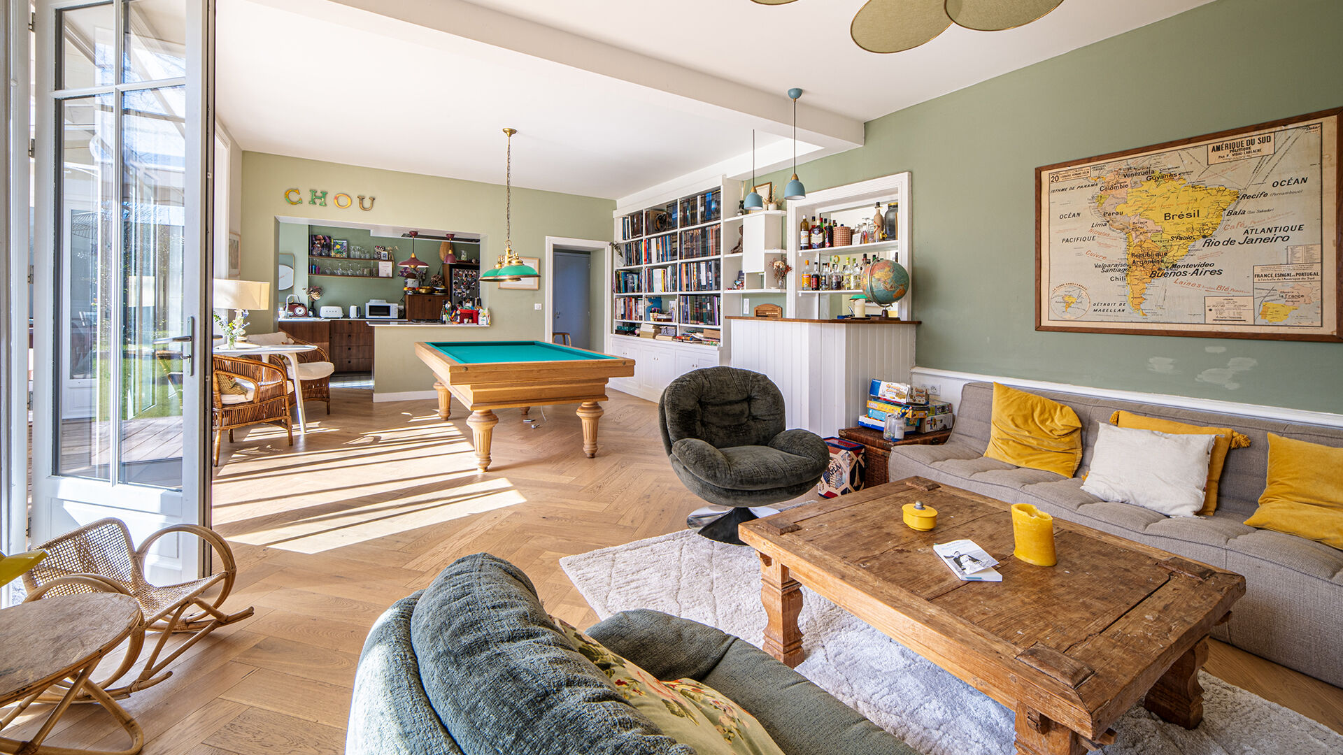 La maison se distingue par ses volumes généreux et son atmosphère chaleureuse. Le rez-de-chaussée accueille une belle réception avec cheminée, une cuisine équipée avec espace repas et deux entrées distinctes permettant une grande souplesse d'usage : famille nombreuse, activité indépendante ou projet évolutif.