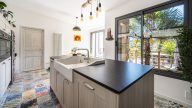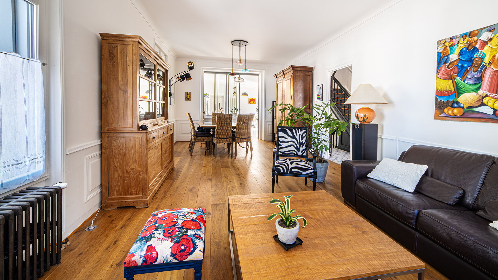 Elle offre de généreux volumes et une luminosité remarquable, avec une double réception dotée d'une cheminée, une vaste cuisine entièrement équipée et son arrière-cuisine attenante.