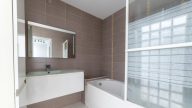 Nantes Saint Pasquier - Au pied du tramway, au calme, dans un immeuble récent, T3 en bon état offrant 90 m2 : vaste salon 46 m2, cuisine aménagée et équipée (plaques à induction, four, lave-vaisselle, réfrigérateur, hotte), 2 chambres sur parquet donnant sur rue au calme, salle de bains, WC. Local vélos.
