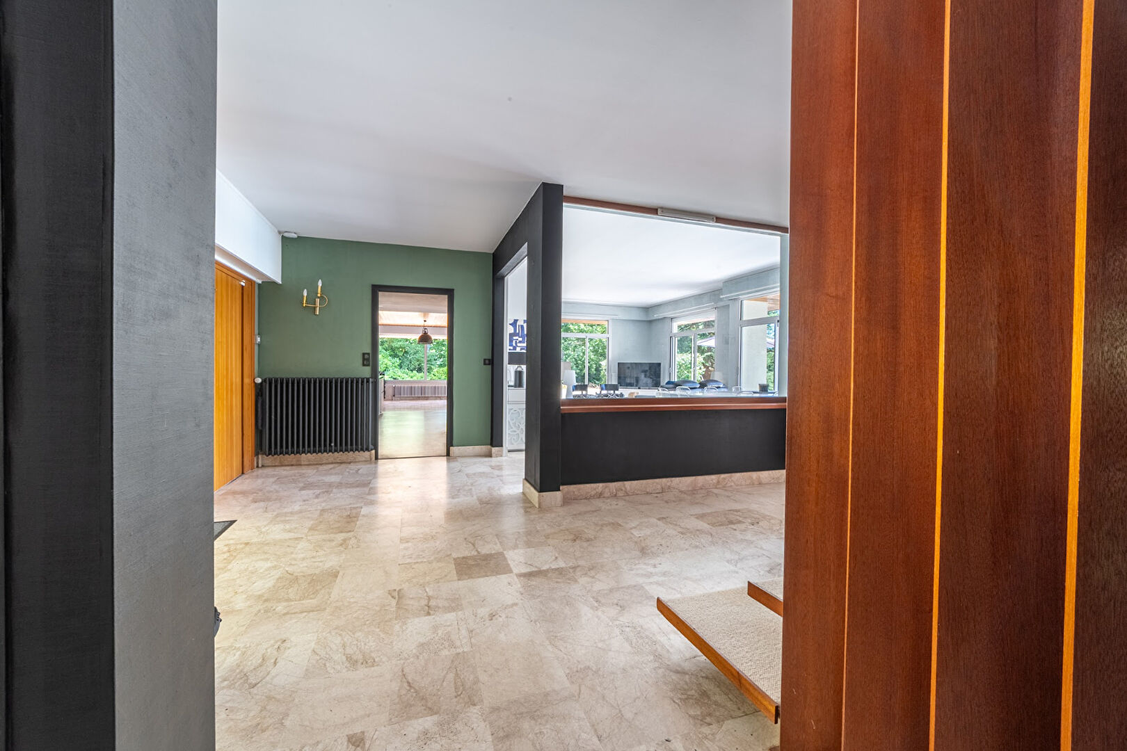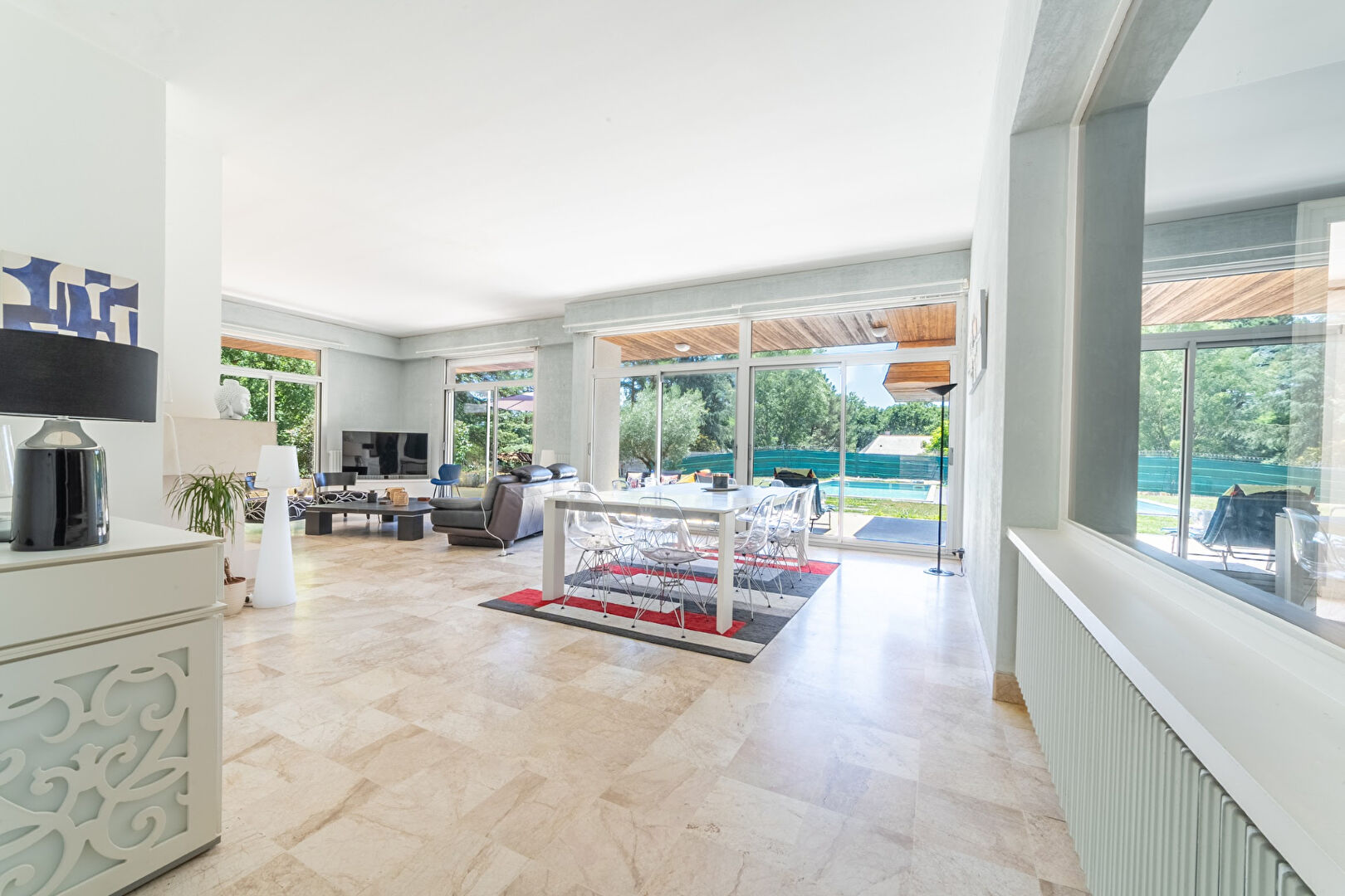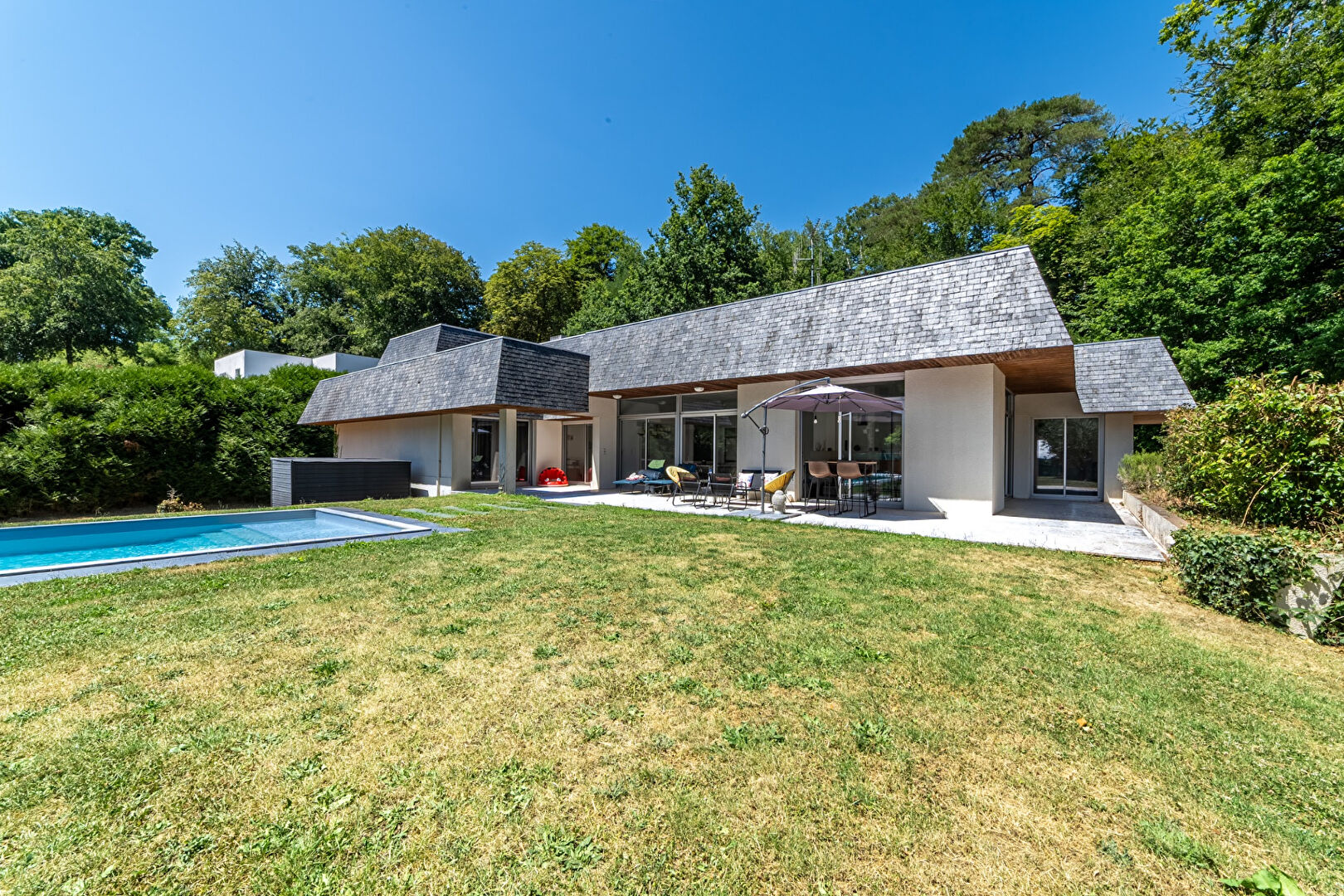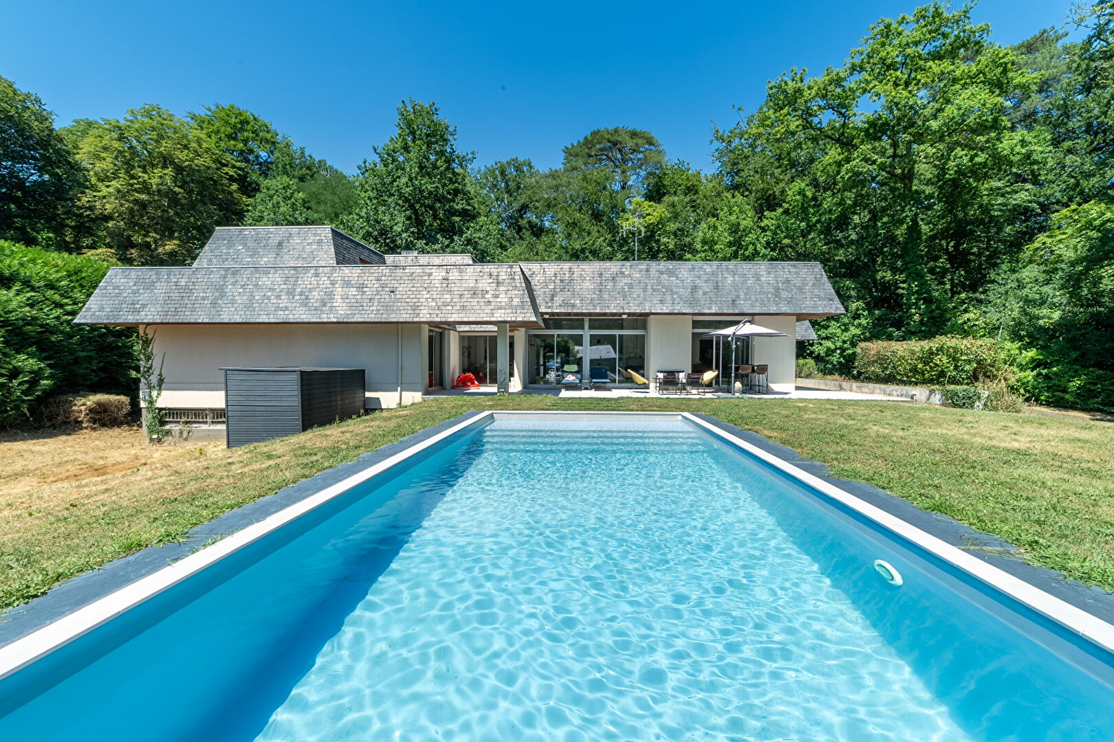 Pièces de vie de plain-pied, ouvertes sur le jardin paysagé et la piscine